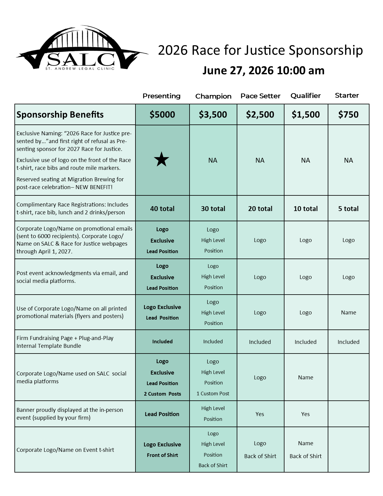 One of the ways that SALC is able to serve our clients is through events like the Race for Justice. The Race for Justice is an integral part of the annual budget at SALC and meeting the fundraising goal is only possible with the support of sponsors and donors.